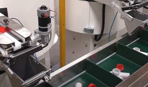 Конвейер с автоматическим узлом запрессовки крышек, выгрузка в упаковщик.